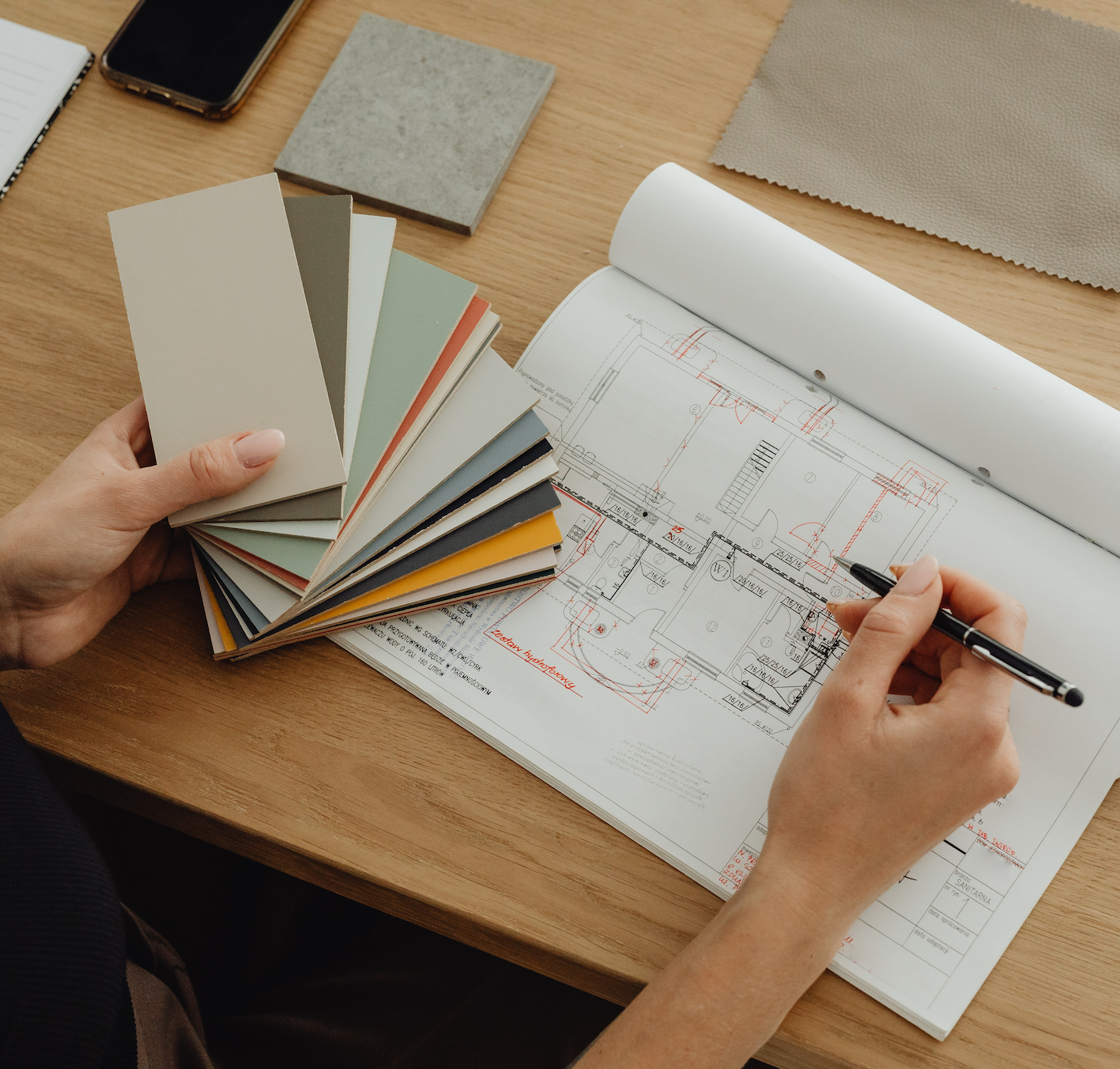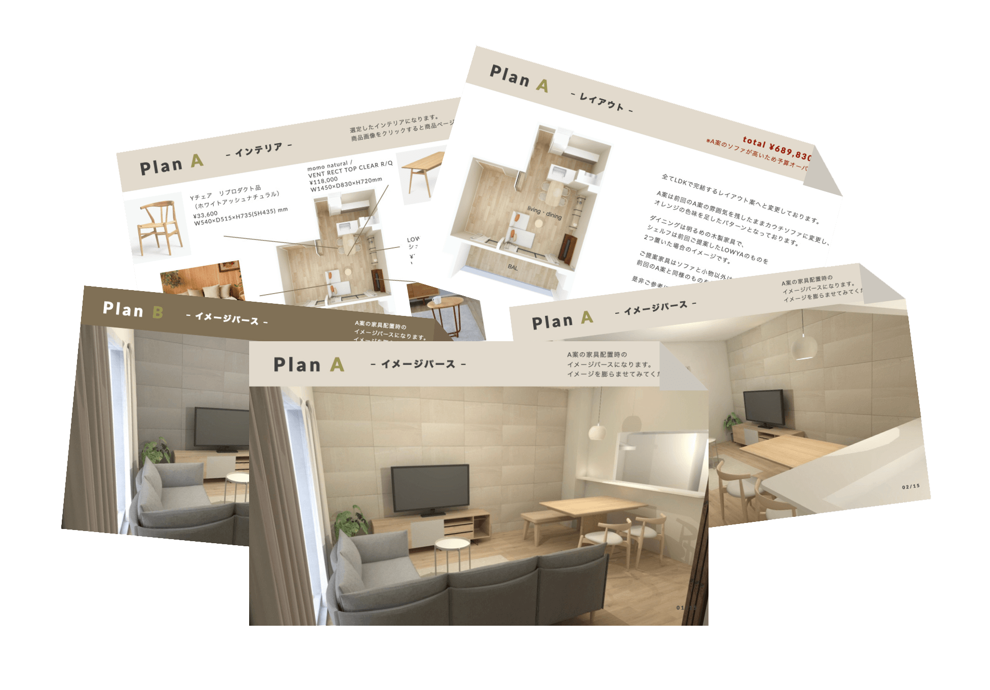 ヒアリングの内容をもとに、お客様の理想の暮らしに沿ったコーディネートやインテリアの選定を行います。複数案プランを作成いたしますのでその中からお好みのものをお選びいただけます。